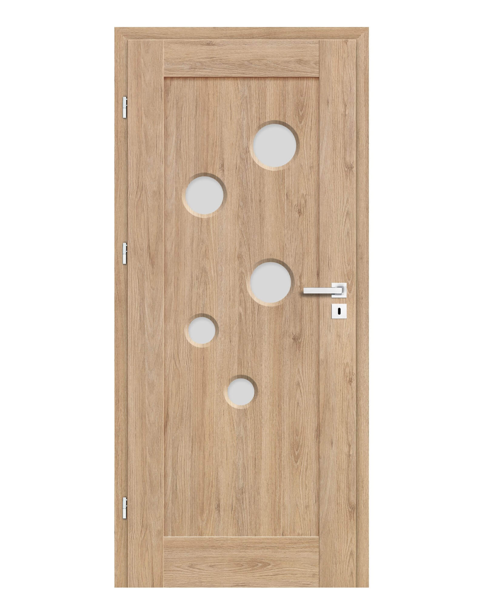 KONSTRUKCJA • skrzydło przylgowe lub bezprzylgowe wykonane w technologii ramiakowej STILE • ramiaki pionowe z warstwowo klejonego drewna obłożone cienkimi płytami HDF pokryte okleiną PREMIUM • płyciny z płyty HDF o grubości 16 mm pokryte okleiną PREMIUM (usłojenie pionowe) • opcjonalnie za dopłatą panele górne poszerzające ościeżnicę – str. 134 OKUCIA • trzy srebrne zawiasy 2-czopowe z regulacją w płaszczyźnie poziomej w skrzydle przylgowym • trzy zawiasy ukryte w skrzydle bezprzylgowym w kolorze srebrnym (opcjonalnie za dopłatą w kolorze czarnym); zawiasy dostarczane oraz wyceniane są z ościeżnicą • zamek zasuwkowy w skrzydle przylgowym i magnetyczny w skrzydle bezprzylgowym na klucz, wkładkę patentową, oszczędnościowy lub z blokadą w kolorze srebrnym; opcjonalnie za dopłatą zamek magnetyczny w kolorze czarnym SZKLENIE • szyba decormat mleczna 4 mm lub za dopłatą szkło klejone VSG 221 szyba mleczna lub czarna NOWOŚĆ bezpieczna, obustronnie gładka