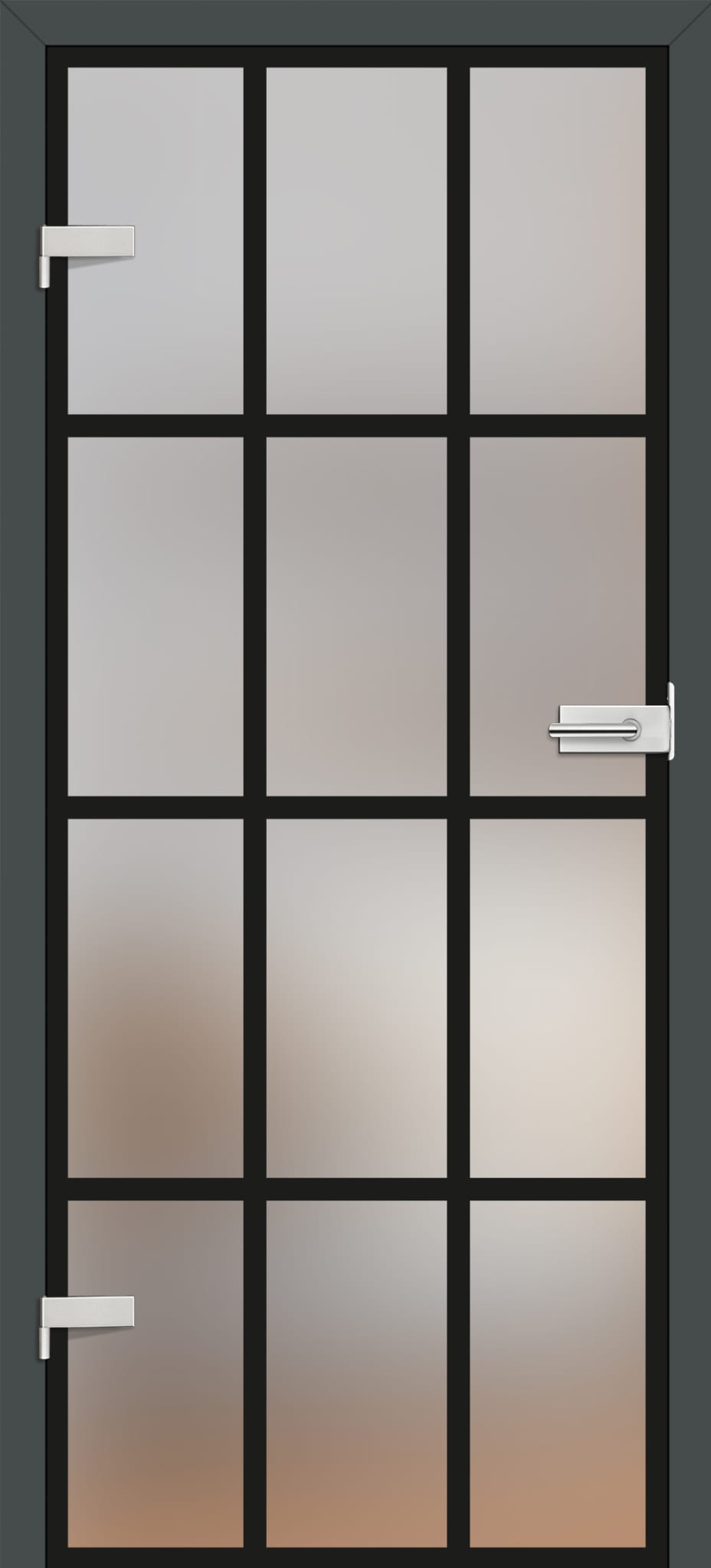 KONSTRUKCJA • szkło hartowane 8 mm, szkło 8 mm barwione w masie (GRAF 26) • możliwość zmiany strony szklenia na REWERS (AWERS szklenie standardowe) • szkło mleczne lub bezbarwne z wzorami malowanymi na czarno lub biało • szerokość (grubość) linii w modelu GRAF 1, 6, 17, 35, 36, 38 wynosi 30 mm • opcjonalnie za dopłatą panele górne poszerzające ościeżnicę – str. 134 OŚCIEŻNICA STAŁA I REGULOWANA • ceny ościeżnic regulowanych i stałych do skrzydeł przylgowych str. 161-163 • brak możliwości zastosowania elektrozaczepu • w ościeżnicach do tafli szklanych stosowany jest zawias z trzpieniem 10 mm • w ościeżnicy regulowanej i stałej możliwość zmiany blachy zaczepowej (za dopłatą) na kolor czarny malowany proszkowo • DO SKRZYDEŁ SZKLANYCH GRAF DOSTĘPNE SĄ TYLKO OŚCIEŻNICE PRZYLGOWE WE WSZYSTKICH DOSTĘPNYCH DEKORACH, OŚCIEŻNICE STALOWE ORAZ OŚCIEŻNICA MALOWANA BIAŁY TYTANOWY UV
