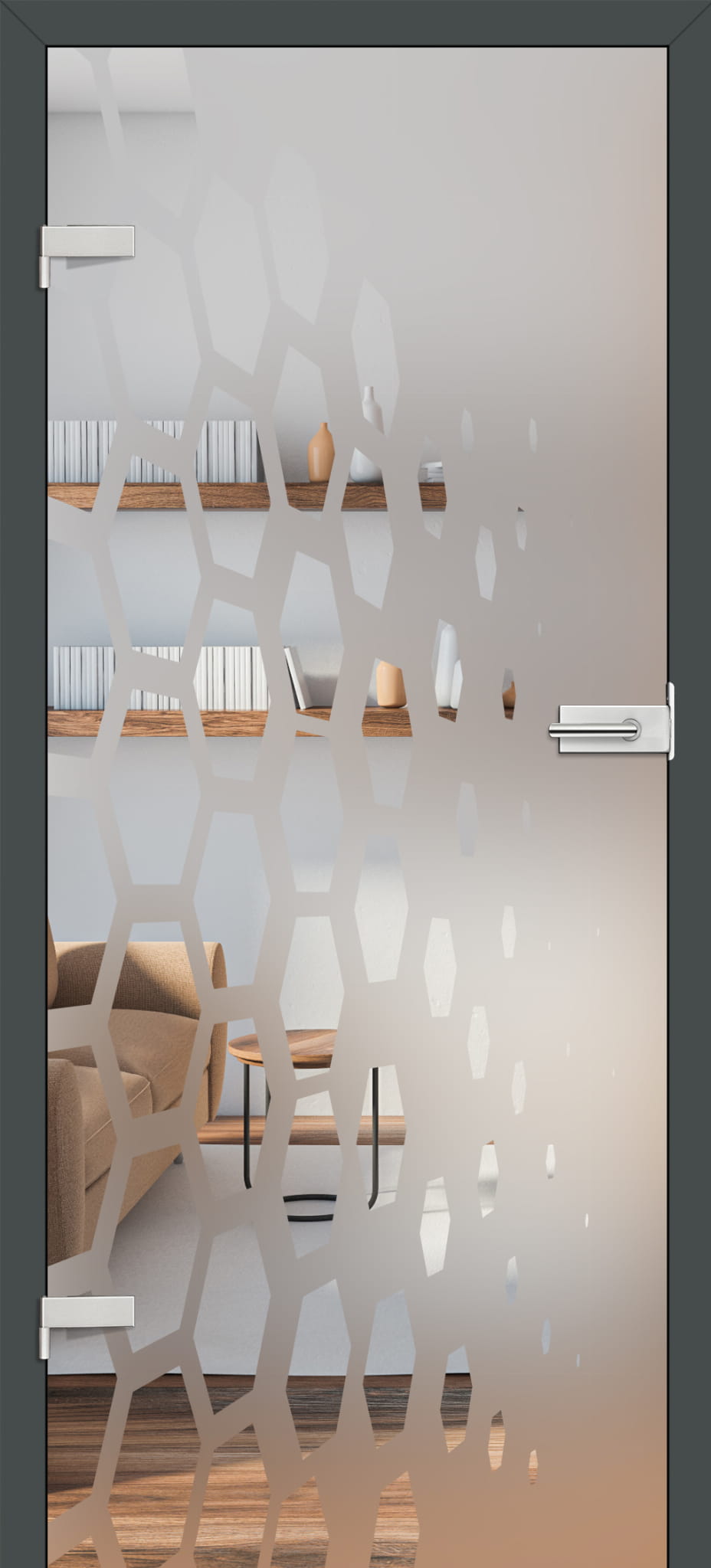 KONSTRUKCJA • szkło hartowane 8 mm, szkło 8 mm barwione w masie (GRAF 26) • możliwość zmiany strony szklenia na REWERS (AWERS szklenie standardowe) • szkło mleczne lub bezbarwne z wzorami malowanymi na czarno lub biało • szerokość (grubość) linii w modelu GRAF 1, 6, 17, 35, 36, 38 wynosi 30 mm • opcjonalnie za dopłatą panele górne poszerzające ościeżnicę – str. 134 OŚCIEŻNICA STAŁA I REGULOWANA • ceny ościeżnic regulowanych i stałych do skrzydeł przylgowych str. 161-163 • brak możliwości zastosowania elektrozaczepu • w ościeżnicach do tafli szklanych stosowany jest zawias z trzpieniem 10 mm • w ościeżnicy regulowanej i stałej możliwość zmiany blachy zaczepowej (za dopłatą) na kolor czarny malowany proszkowo • DO SKRZYDEŁ SZKLANYCH GRAF DOSTĘPNE SĄ TYLKO OŚCIEŻNICE PRZYLGOWE WE WSZYSTKICH DOSTĘPNYCH DEKORACH, OŚCIEŻNICE STALOWE ORAZ OŚCIEŻNICA MALOWANA BIAŁY TYTANOWY UV