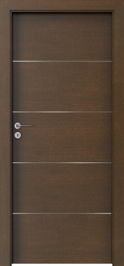KONSTRUKCJA SKRZYDŁA Wypełnienie skrzydła stanowi wkład stabilizujący wzmocniony wewnętrznym ramiakiem. Całość obłożona jest płytą oklejoną wysokiej jakości okleiną naturalną. Skrzydła uzupełnione są aluminiowymi intarsjami w kolorze srebrnym o szerokości 6 mm. Powierzchnia skrzydła zabezpieczona jest ekologicznymi lakierami wodnymi, okleiny z grupy: Select, Naturalny Dąb, Satin (za wyj. Biały) utwardzone są w technologii UV (półmat). Wypełnienie płytą wiórową otworową za dopłatą. AKCESORIA W CENIE SKRZYDŁA • Drzwi przylgowe: trzy zawiasy czopowe standard lub PRIME; bezprzylgowe: dwa zawiasy 3D • Zamek z czołem srebrny połysk lub złoty połysk: na klucz zwykły, z blokadą łazienkową lub dostosowany pod wkładkę patentową • Przygotowanie do skrótu, maksymalnie 60 mm • Pochwyt okrągły (do drzwi przesuwnych)