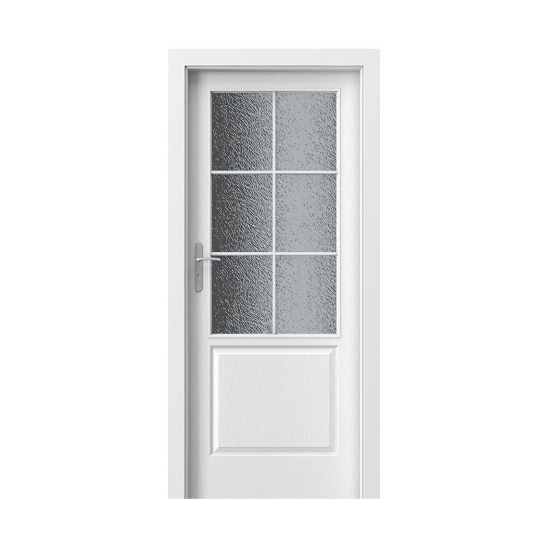 KONSTRUKCJA SKRZYDŁA Wypełnienie stabilizujące dwustronnie obłożone tłoczoną płytą HDF. AKCESORIA W CENIE SKRZYDŁA • Dwa lub trzy zawiasy czopowe standard lub PRIME (opcja za dopłatą) • Zamek: na klucz zwykły, z blokadą łazienkową lub dostosowany pod wkładkę patentową • Szyba wzór: „chinchilla” • Pochwyt okrągły (do drzwi przesuwnych) OŚCIEŻNICE Rekomendowane ościeżnice przylgowe: • PORTA SYSTEM w okleinie Portadecor str. 200 • MINIMAX w okleinie Portadecor str. 198 • STALOWE str. 212-217 UWAGI • Norma PN EN 14351-2:2018-12. • Możliwość dowolnego zestawienia wymiarów skrzydeł w drzwiach podwójnych. • Proponujemy klamkę i szyld Royal, patrz str. 225.