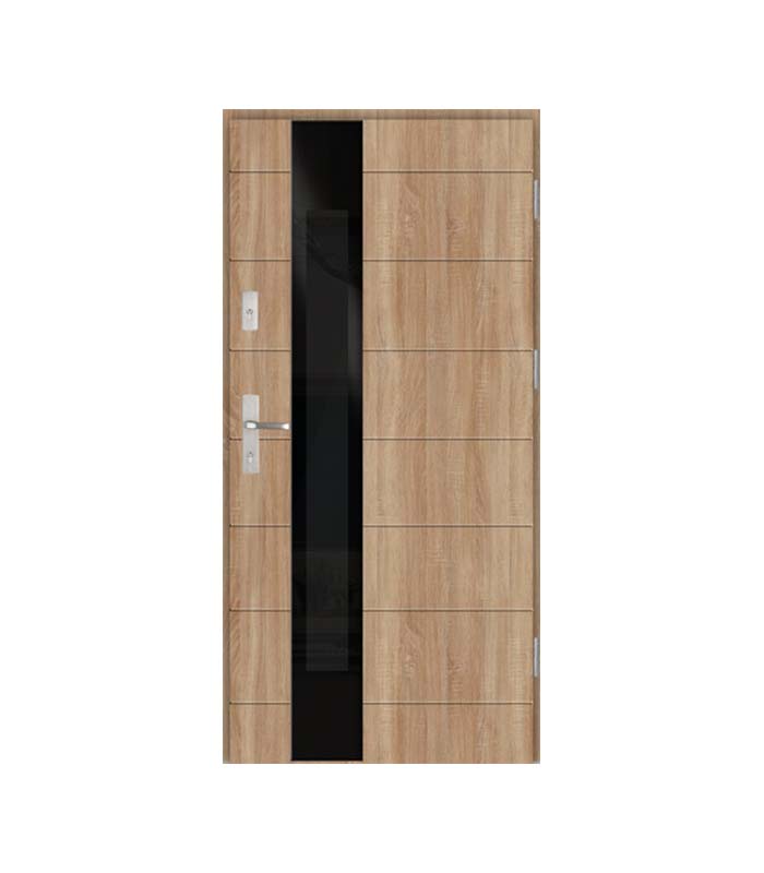 Drzwi zewnętrzne z kolekcji Glass Loft zachwycają taflami szkła aplikowanego bezpośrednio na skrzydło drzwiowe. Pod szklaną, czarną aplikacją Lacobel znajduje się pakiet szybowy umożliwiający przepuszczanie światła. To piękne, czarne wzornictwo, dzięki któremu zobaczysz więcej. Lacobel to delikatnie przezierna, barwiona na czarno tafla szkła o wysokim połysku, aplikowana bezpośrednio na drzwi.